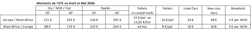 Since January 1st 2026, the EU ETS regulation covers 100% of CO2 emissions (compared to 70% in 2025). The use of renewable fuels is also being stepped up in order to reduce their environmental impact. The costs associated with complying with this legislation (+€6/TEU dry in 2026) are included in our ETS. since 01/04/2026, the ETS Surcharge amounts, revisable each month, are as follow :